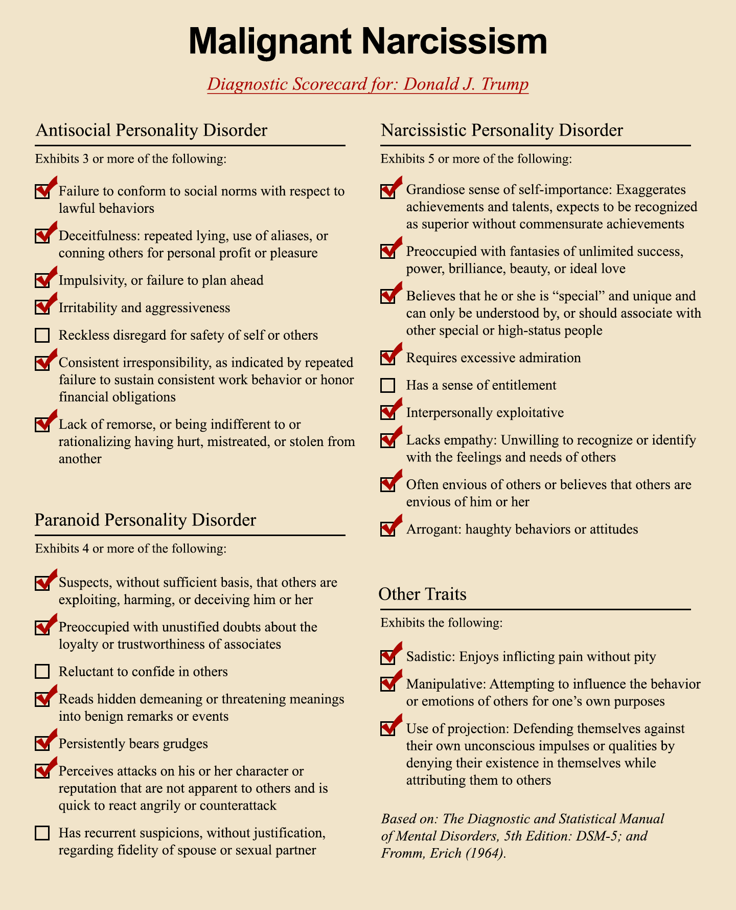 Here’s Donald Trump’s scorecard for Malignant Narcissism: